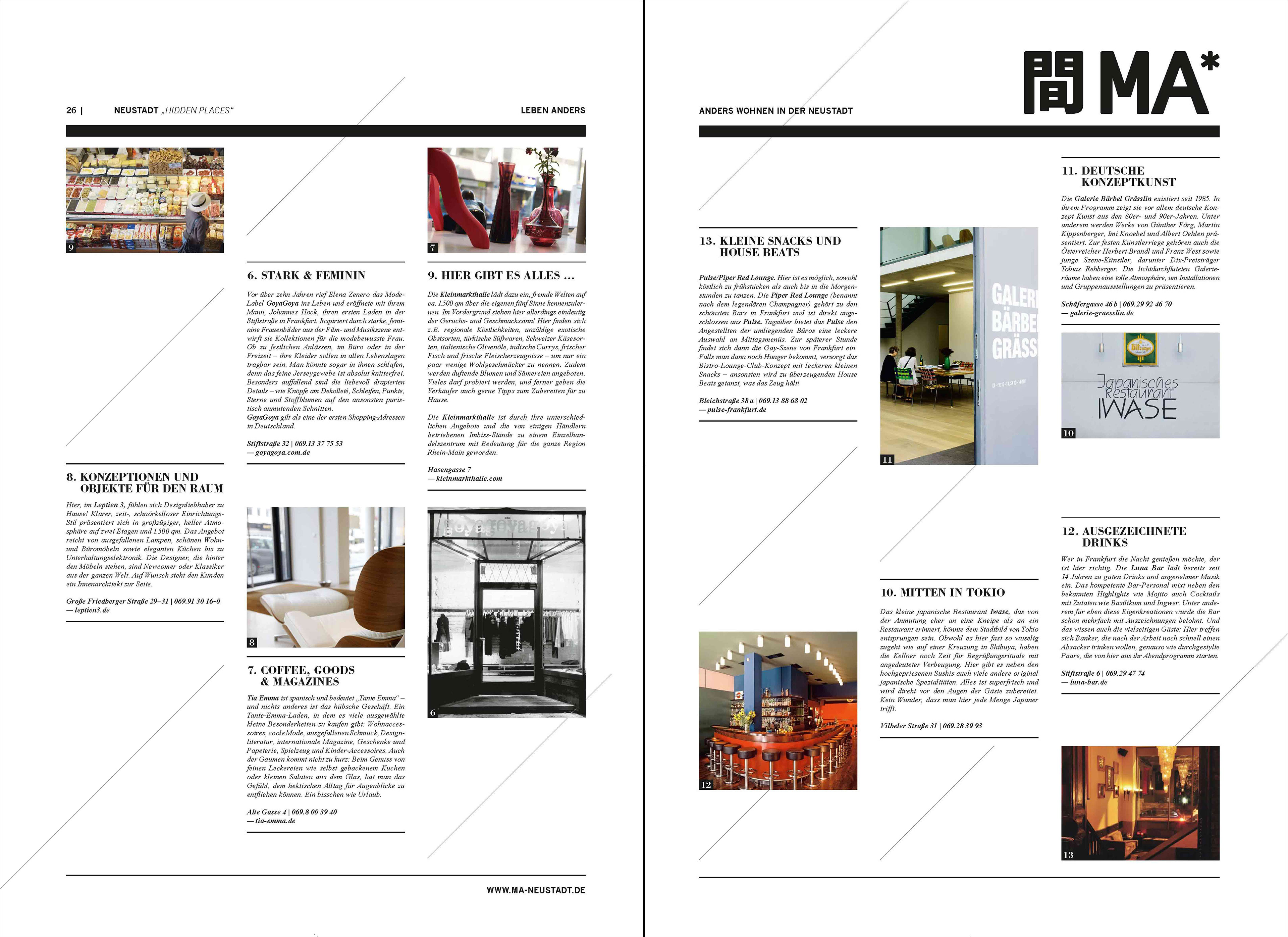 Die Neustadt gilt als «Rückseite» ihrer berühmten Schwester, der Frankfurter Shopping Meile Zeil. Mittendrin befindet sich die alte Diamantenbörse, ein mehrstöckiges, leer stehendes Bürogebäude, das vor allem durch seine Verlustgeschichte für Schlagzeilen sorgte. Eine Totalsanierung sollte das Gebäude in einen Mix aus luxuriösen Eigentumswohnungen und hippen Designerläden verwandeln – und so zur Wiederbelebung des Quartiers beitragen. Unter dem Dach «MA – wohnen anders»* entstand ein Kommunikationskonzept, das bewusst von bisherigen Ansätzen abwich und die Besonderheit des Projekts hervorhob. Zu meinen Aufgaben gehörte: Konzeption | Texterstellung | Editorial Design | Storytelling | Website |Markenkommunikation | Kundenkommunikation